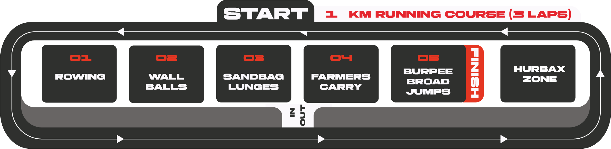 • En la categoría parejas o equipos, todos los integrantes deben correr los 1 000 m de cada tramo al mismo ritmo y entrar juntos en el workout siguiente; no hacerlo acarrea una penalización en el cronometraje.